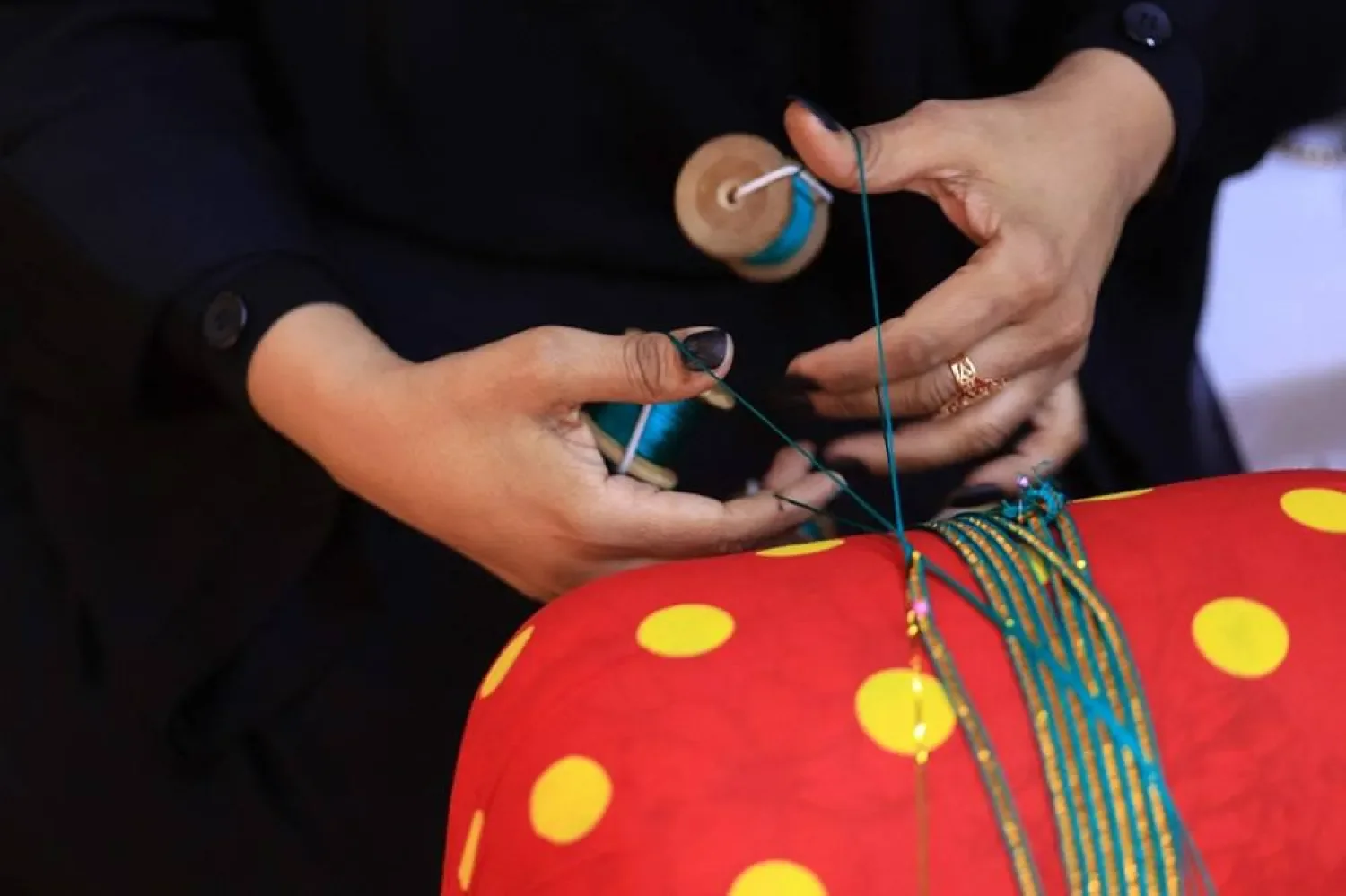 An artisan from Qasr Al Hosn (House of Artisans) in Abu Dhabi works live on a piece of Talli.