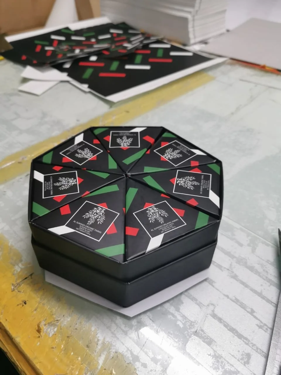 Choosing a full sublimation print on paper, the packaging design and pattern is a modern interpretation of the UAE's colors, drawing a direct visual link to the beautiful textures and patterns found in traditional Al Khous basket weaving. The core of the design lies in the 'box-inside-a-box' concept. My intention was to provide a thoughtful solution to assortment consumption, where certain flavors often go uneaten. By including an assorted sampler alongside six individual flavor boxes, consumers can mindfully enjoy each type, with the flexibility to save or share the rest.